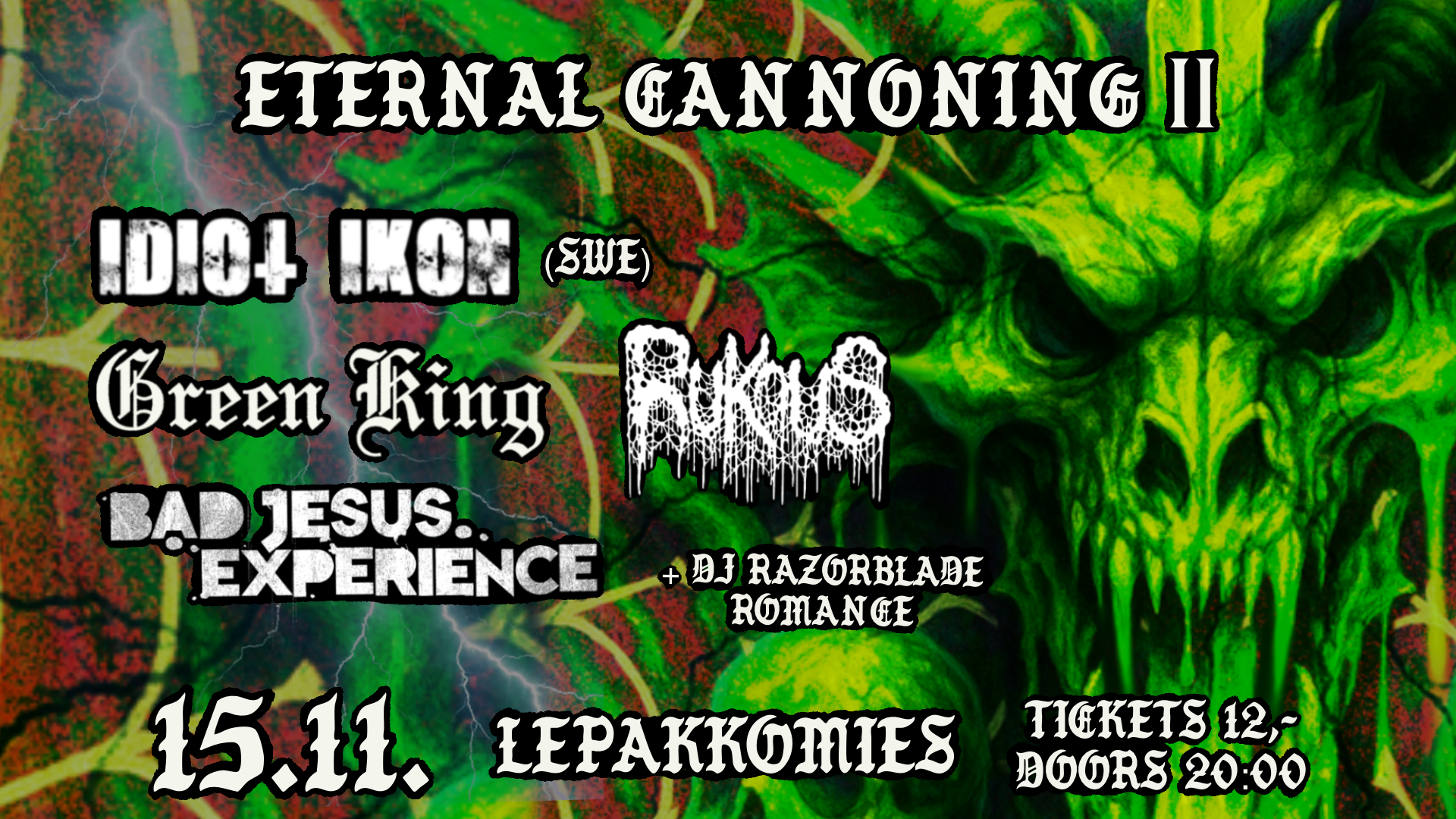 Lavalla nähdään metalpunkia räimivä ruotsalaisyhtye IDIOT IKON sekä suomalaista hardcorea ja heavy metalia pasauttelevat BAD JESUS EXPERIENCE, GREEN KING sekä RUKOUS!