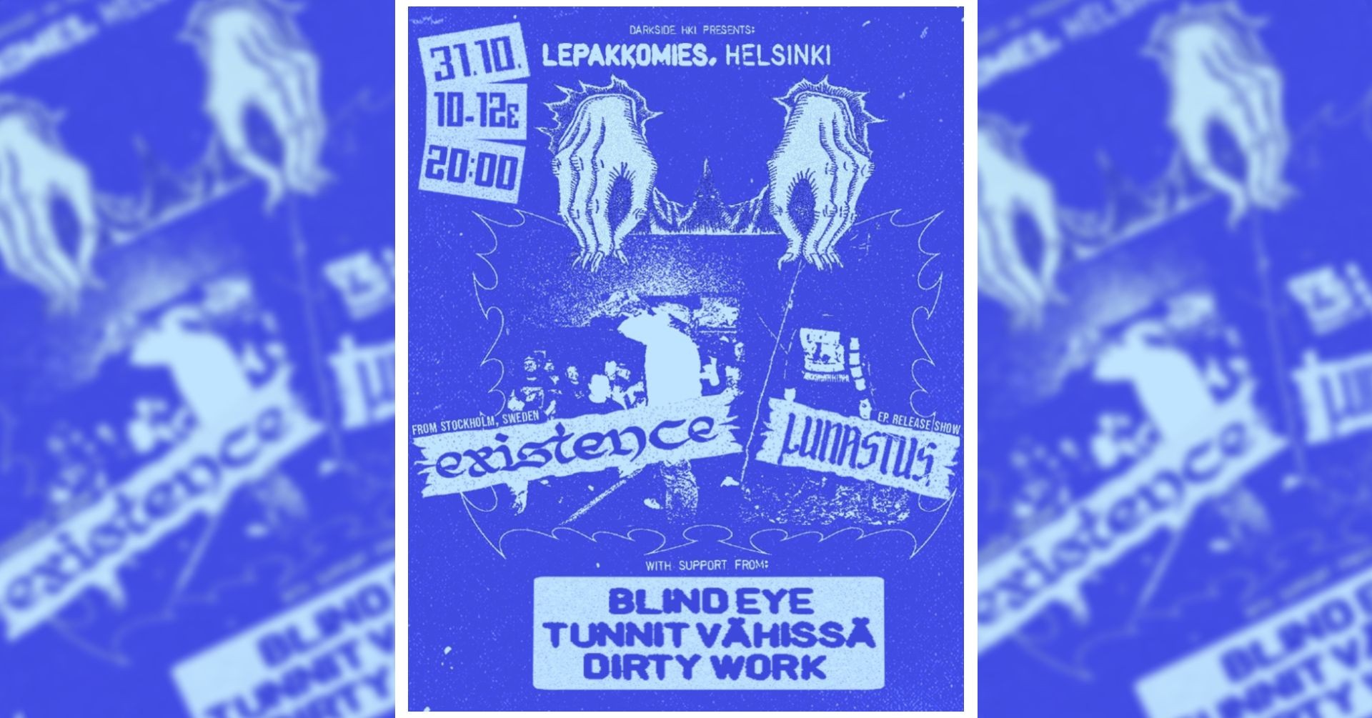 Muutamaan otteeseen Suomessa soittaneen ruotsalaisen metallisen hardcoren kärkinimi, Existence, yksittäiselle Helsingin keikalle muutaman vuoden tauon jälkeen. Quality Control HQ:n kautta kaksi vuotta sitten ”Go to Heaven”-LP:n ja tänä vuonna ”You Can’t Escape My Hate/Pain of Expecting Pain”-tuplasinkun Grand Schemen kautta julkaissut bändi on mahdollisesti tiukemmassa kunnossa kuin koskaan. Kannattaa tulla todistamaan. Tämän lisäksi illan aikana juhlistetaan Lunastuksen uutta ”Silmät täynnä tuhkaa”-EP:n julkaisua muiden kovien kotimaisten bändien kanssa.
