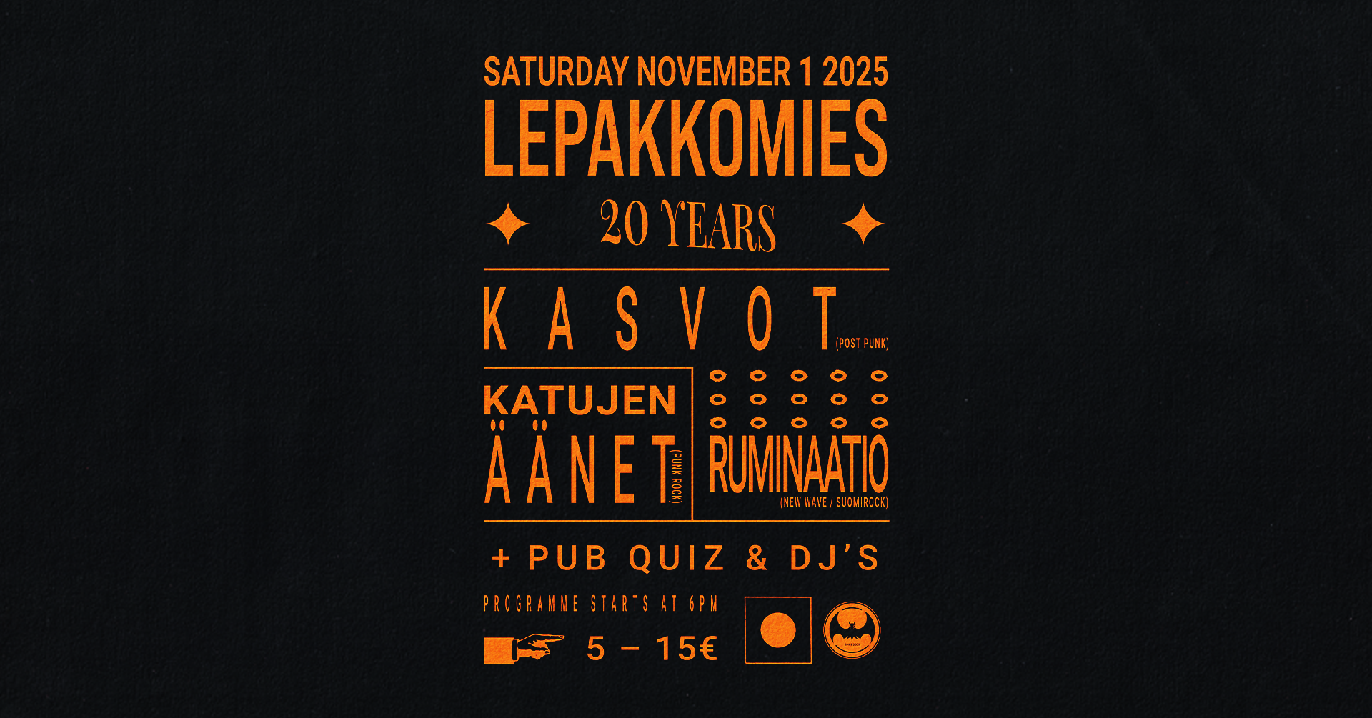 LEPAKKOMIES 20Y BIRTHDAY BASH: KATUJEN ÄÄNET + KASVOT + RUMINAATIO