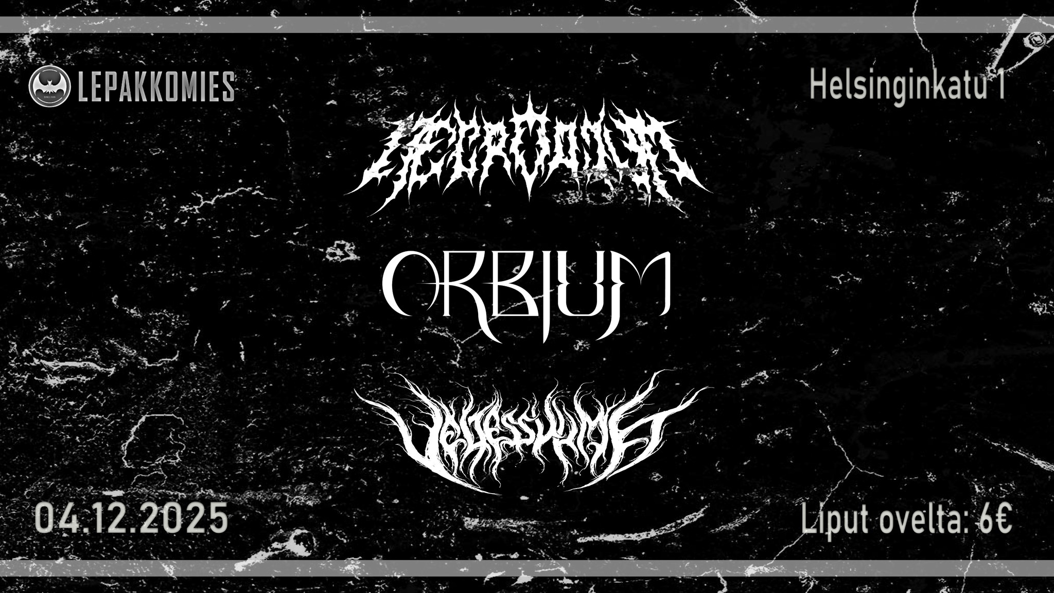 Alkuperäinen ilmoitettu yhtye Veljessurma joutui perumaan tapahtuman loukkaantumisen vuoksi, joten tilalle ilmoitetaan lähiaikoina korvaava yhtye.