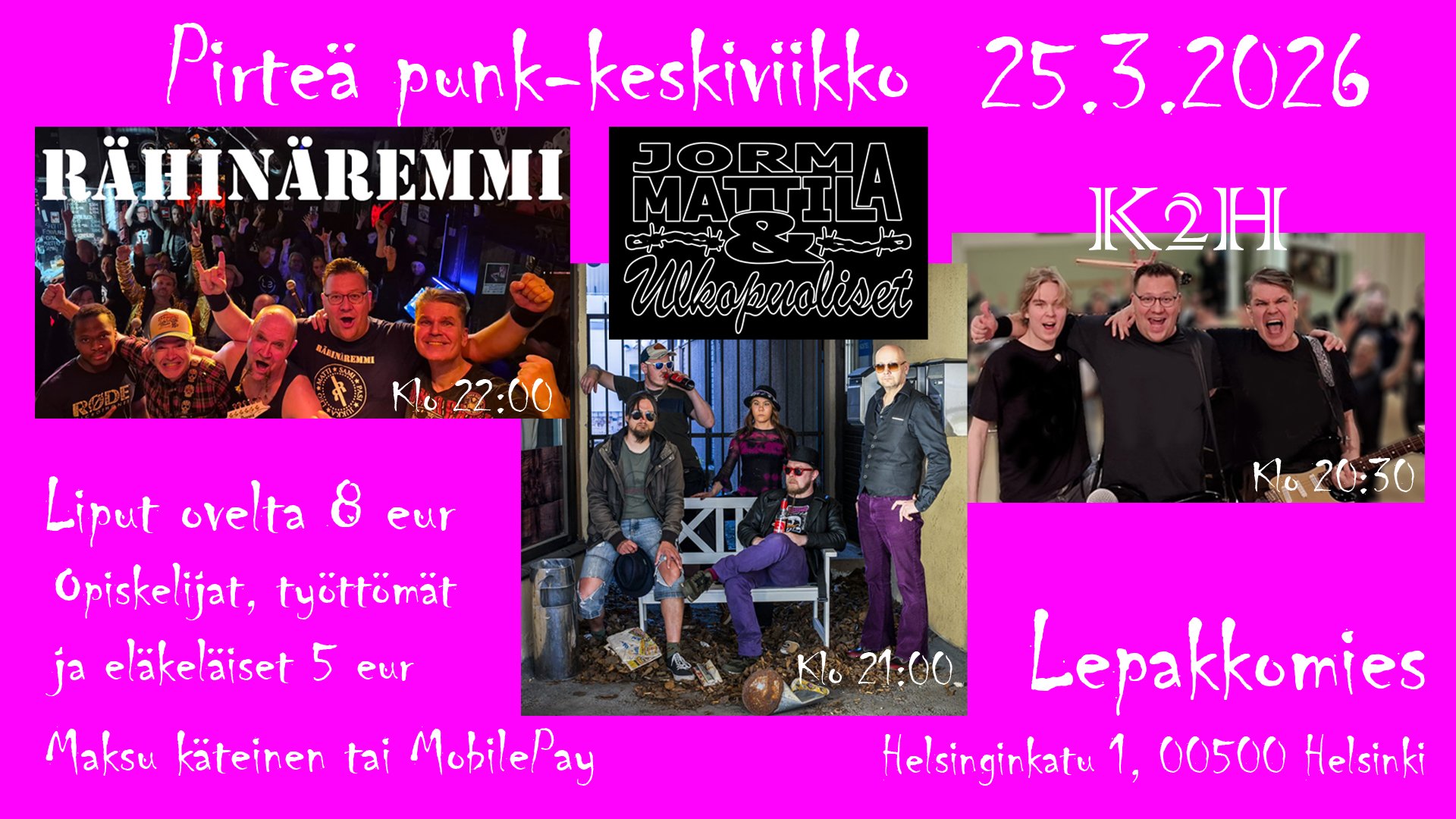Lepakkomiehen kevättalven keskiviikko kuluu pirteän suomenkielisen punkin tahdeissa kolmen bändin voimin: K2H, Jorma Mattila & Ulkopuoliset sekä Rähinäremmi. Nyt yhdellä lipulla saat mahtipläjäyksen, joten olisi niin kiva nähdä juuri sinut keikalla Lepiksessä. Tervetuloa!